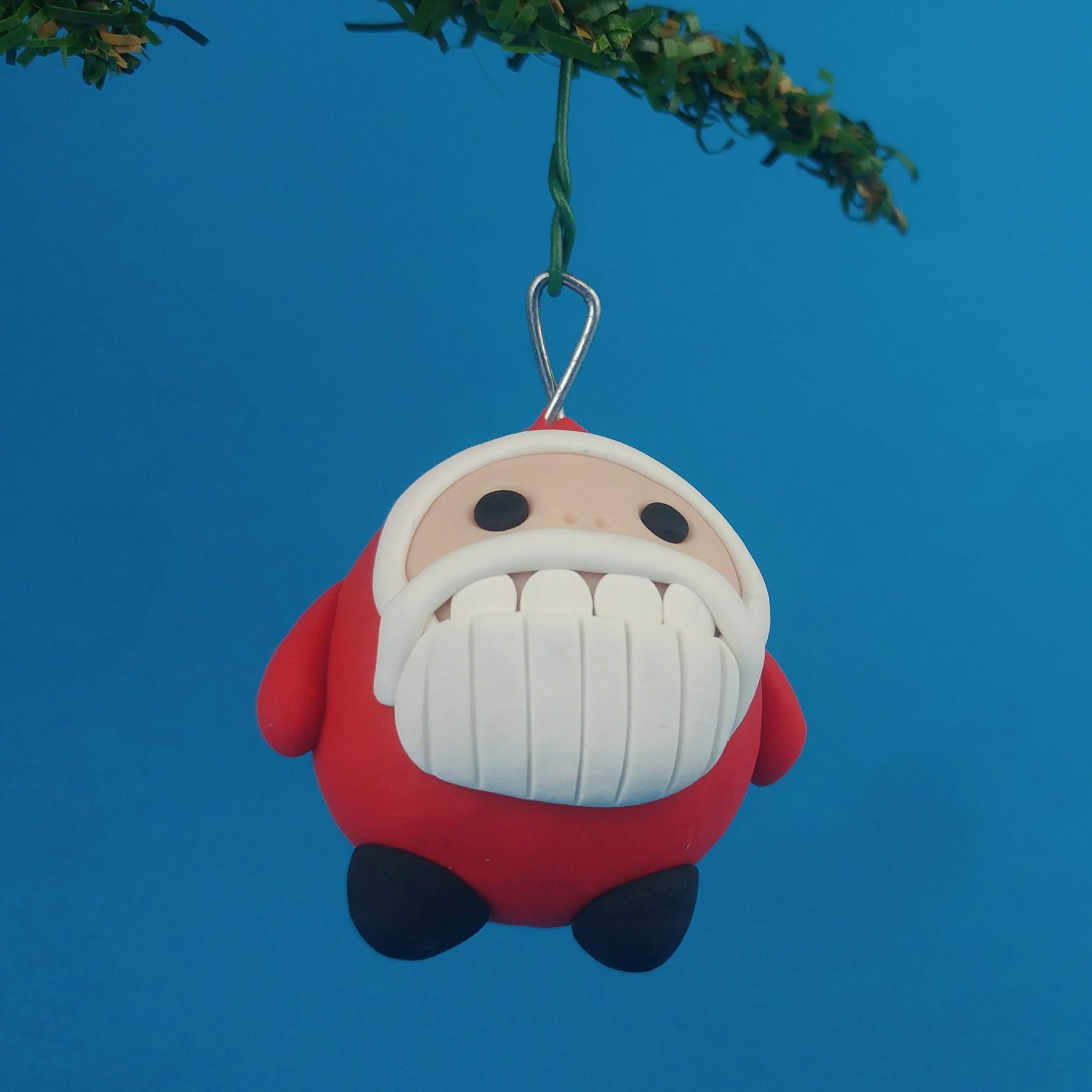 Santa Ball is handmade from polymer clay and also has a tin foil ball for insides, which makes him nice and light and more likely to bounce than break should he ever wiggle his way off his branch. He's got the Nugs logo branded on his backside too, so you know who to call when that song drives you mad.